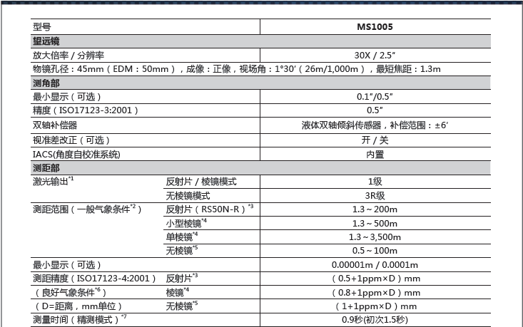 標(biāo)準(zhǔn)單棱鏡測程3500m,測距精度“0.8mm+1ppm”;